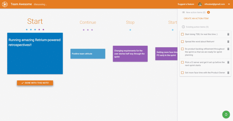 Step Six:Discussion. This is where I believe you are going to get the most benefits from this product. In the discussion phase, only one idea group at a time will be displayed. Here, you will create action items. When you're ready, choose the next topic (group). Add more action items to your Action Plan. You can then choose to review the action plan or end the retrospective. This is by far the step most retrospectives fail at. No action plan is easily maintained and worked.
